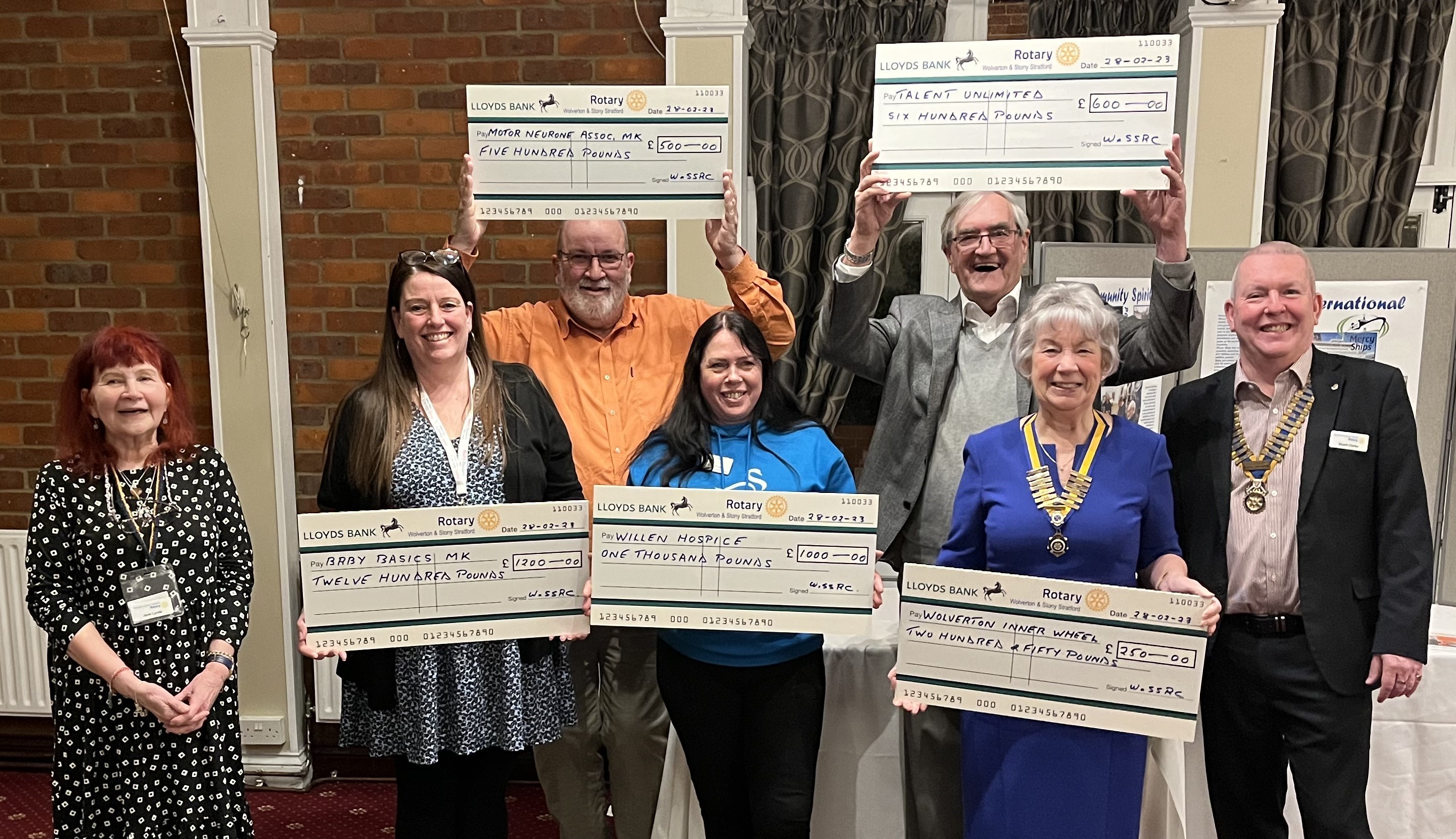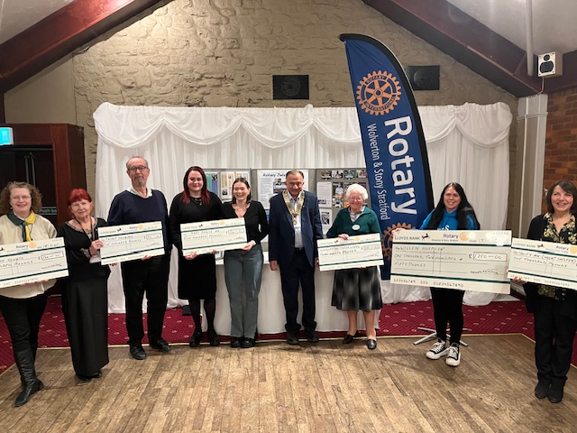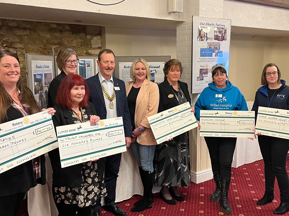 And so, at a special meeting on 18 February, the club was delighted to welcome guests from various local charities and organisations to receive their cheques, including Willen Hospice, Unity MK (formerly Winter Night Shelter), Baby Basics MK, Wolverton Scouts, Wolverton Inner Wheel Club and Talent Unlimited (a local group which develops creative talents of people with autism). The club has also been very pleased to be able to make further donations direct to several other charities and organisations including Stony in Bloom, Wolverton in Bloom and Keech Hospice.