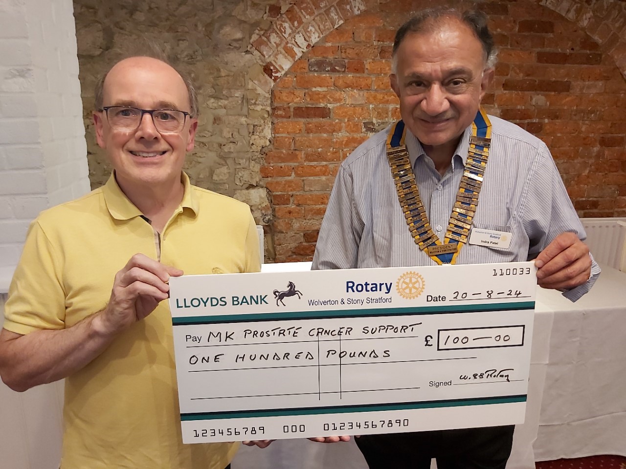 Overall one man in every 8 gets prostate cancer. This was one of many statistics explained to members at a recent presentation by David Wiggins and Haydn Sinfield from MK Prostate Cancer Support Group. To help with the group's important work the club was pleased to make a donation of £100. Pictured above is President Indra handing over the cheque.