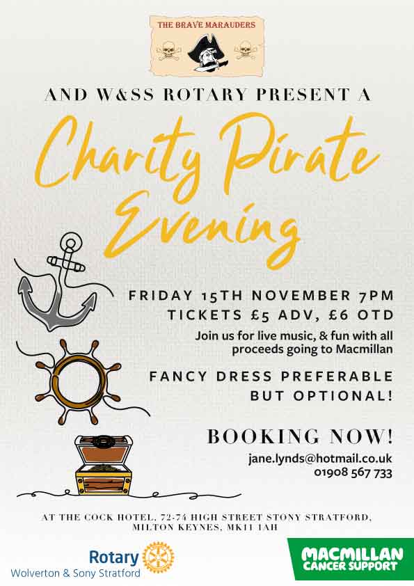 Join us for a really fun pirate themed musical evening with local band The Brave Marauders at the Cock Hotel, Stony Stratford. Doors open 6.30 for 7.00pm with tickets in advance only £5.00 from Jane Lynds, email above. And it will all be in aid of a very good cause.