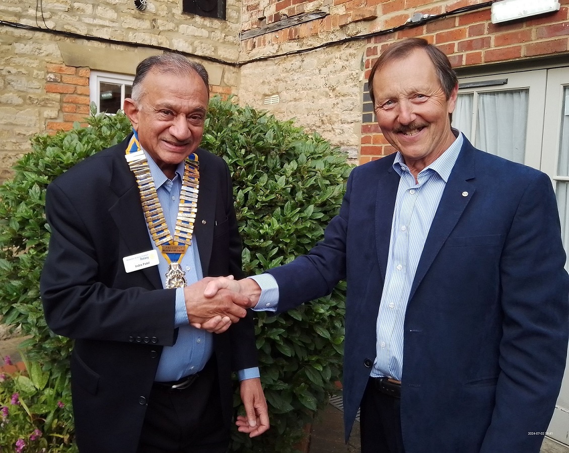 Pictured left is our new Club President, Indra Patel, receiving the chain of office from retiring President Chris Byard.